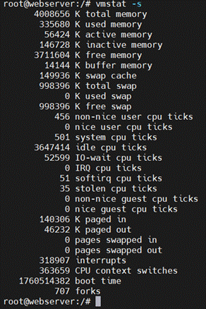| ✔️Çeşitli olay sayaçlarını ve bellek istatistiklerini içeren bir tablo görüntüler. Bu görüntüleme tekrarlanmaz. | $ vmstat -s, --stats | ||||||||||||||||||||||||||||||||||||||||||||