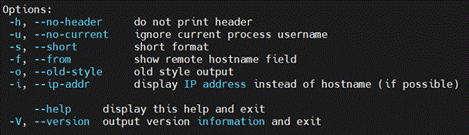| w: | Kimin oturum açtığını ve ne yaptığını gösterin. | $ w [options] [user] | |||||||||||||||||||||||||||||||||||||||||||