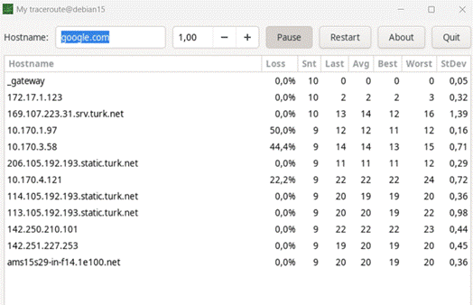 | mtr: | ping ve traceroute özelliklerini birleştirir (canlı analiz aracı): | # mtr google.com | |||||||||||||||||||||||||||||||||||||