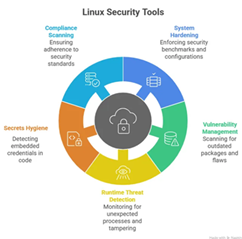 | Linux güvenlik araçları, her biri Linux ortamlarını korumanın belirli bir yönünü ele alan birçok farklı biçimde gelir. Sistem yapılandırmalarını güçlendirmekten güvenlik açıklarını tespit etmeye, çalışma zamanını etkinliklerini izlemeye, gizli bilgileri yönetmeye ve uyumluluğu sağlamaya kadar bu araçlar, ekiplerin karmaşık ve hızla değişen altyapıları güvence altına alınmasına yardımcı olur. | ||||||||||||||||||||||||