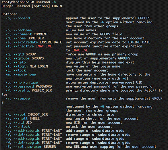 | usermod: (ec) | usermod komutu veya "mod user", Linux'ta bir kullanıcının özelliklerini komut satırı aracılığıyla değiştirmek için kullanılan bir komuttur. Bir kullanıcı oluşturduktan sonra, bazen parola veya oturum açma dizini gibi özelliklerini değiştirmemiz gerekir, bu nedenle Usermod komutunu kullanırız. Bir kullanıcının bilgileri aşağıdaki dosyalarda saklanır: | ||||||||||||||||||||||||||||||||||||||||||||