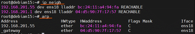 | arp: / ip neigh | arp komutu, Sistemin ARP önbelleğini yönetir. Ayrıca ARP önbelleğinin tamamının boşaltılmasını sağlar. ARP, Adres Çözümleme Protokolü anlamına gelir. Bu protokolün temel işlevi, bir sistemin IP adresini MAC adresine çözümlemektir ve bu nedenle 2. seviye (Veri Bağlantı Katmanı) ile 3. seviye (Ağ Katmanı) arasında çalışır. | ||||||||||||||||||||||||||||||||||||||